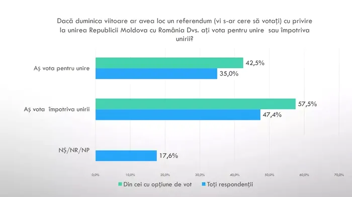Potrivit aceleiași cercetări, dacă duminica viitoare ar fi organizat un referendum pentru unirea Republicii Moldova cu România, 42,5% s-ar pronunța „pentru”.