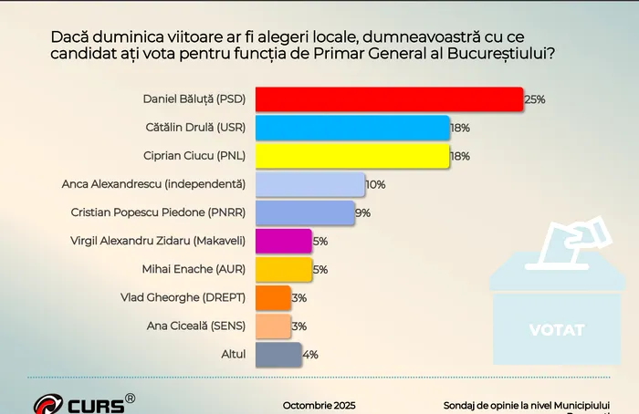 Primarul Sectorului 4, Daniel Băluţă (PSD), ar întruni 25% din voturi, dacă săptămâna viitoare ar avea loc alegeri pentru Primăria Capitalei, fiind urmat de deputatul Cătălin Drulă (USR) şi primarul Sectorului 6, Ciprian Ciucu (PNL), ambii cu 18%, arată un sondaj CURS dat publicităţii duminică. În schimb, Nicușor Dan rămâne liderul cu cea mai bună imagine la nivelul Capitalei, dar pierde din procente.