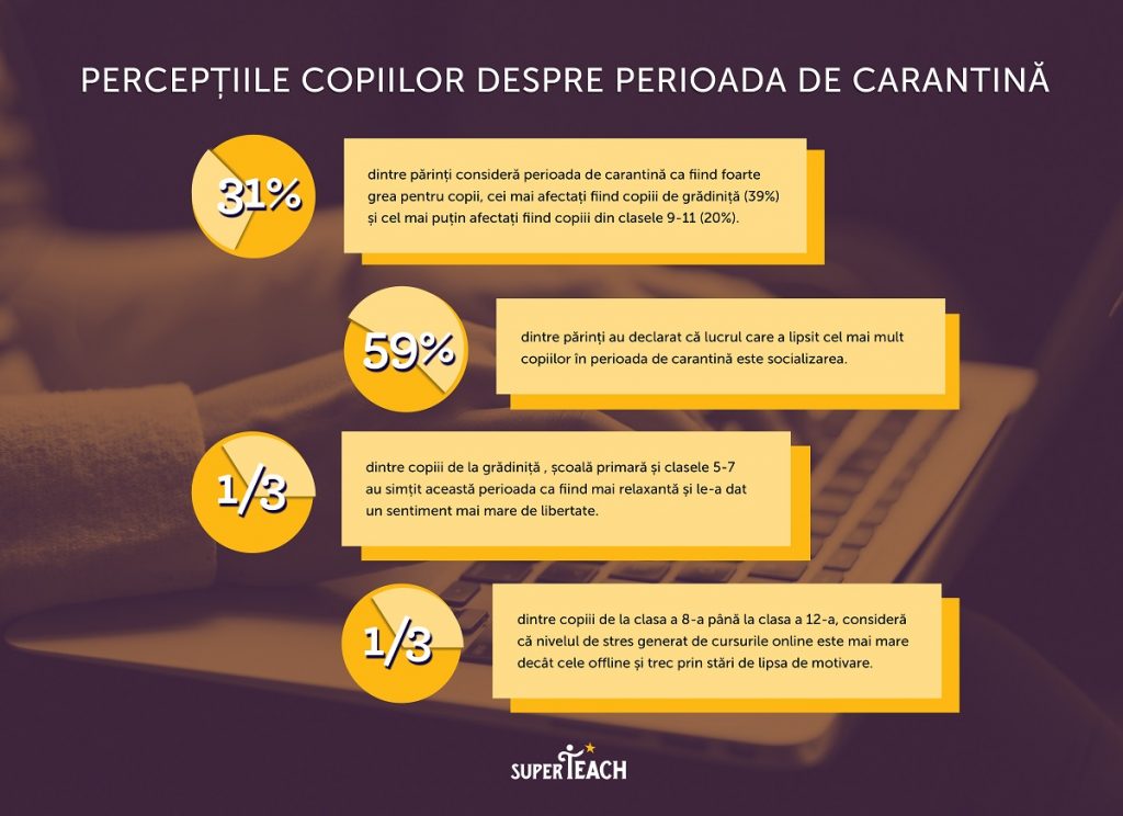 Conform rezultatelor studiului Vocea SuperTeach@Părinți, la care au răspuns 3.800 părinți din aproape toate județele țării, cu privire la raportarea copiilor la starea de urgență și la școala online, 31% dintre respondenți au considerat că perioada de carantină a fost foarte grea pentru cei mici, cei mai afectați fiind copiii de grădiniță (39%) și cel mai puțin afectați fiind cei din clasele IX-XI (20%).