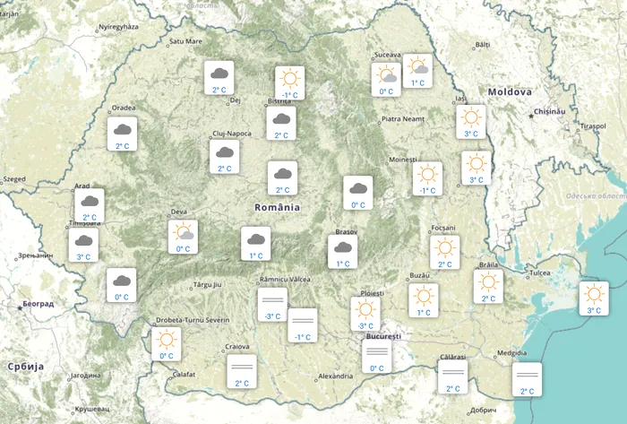 La ora 07:00, cea mai scăzută temperatură din România s-a înregistrat la Râmnicu Vâlcea și Ploiești – minus 3 grade Celsius.