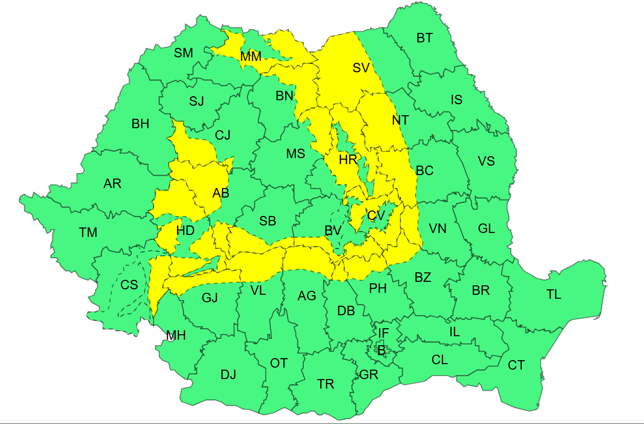 La munte și eventual în Subcarpații Moldovei, precum și în sudul și estul Transilvaniei, vor fi precipitații mixte. La atitudini de peste 1.400 m va ninge și se va depune strat de zăpadă local consistent.