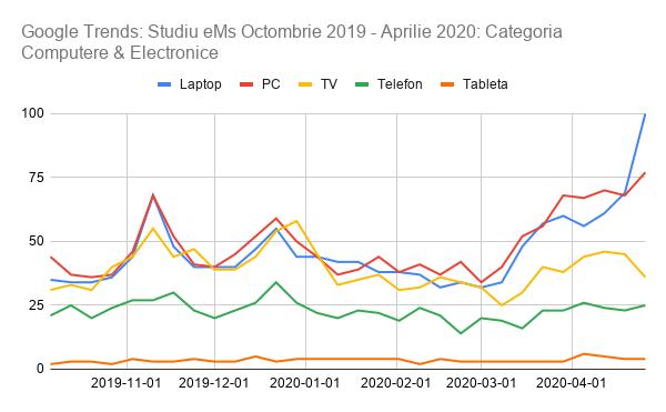 În acest context, în luna aprilie 2020, interesul pentru laptopuri a depăşit maximul de căutare anual al Black Friday 2019 cu peste 30%, conform rezultatelor celor mai populare căutări Google.