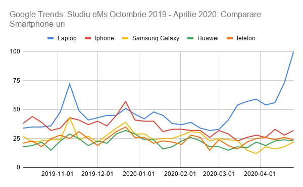 Termenii „iPhone” şi „Samsung Galaxy” au marcat o creştere uşoara în volumul căutărilor online la jumătatea lunii aprilie, dar sunt în continuare sub medie, şi cu mult sub căutările totale pentru laptopuri.