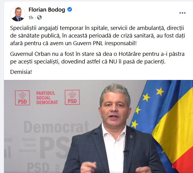 „Specialiştii angajaţi temporar în spitale, servicii de ambulanţă, direcţii de sănătate publică, în această perioadă de criză sanitară, au fost daţi afară pentru că avem un Guvern PNL iresponsabil! Guvernul Orban nu a fost în stare să dea o Hotărâre pentru a-i păstra pe aceşti specialişti, dovedind astfel că nu îi pasă de pacienţi”, a scris fostul ministru al Sănătăţii Florian Bodog pe pagina sa de Facebook.