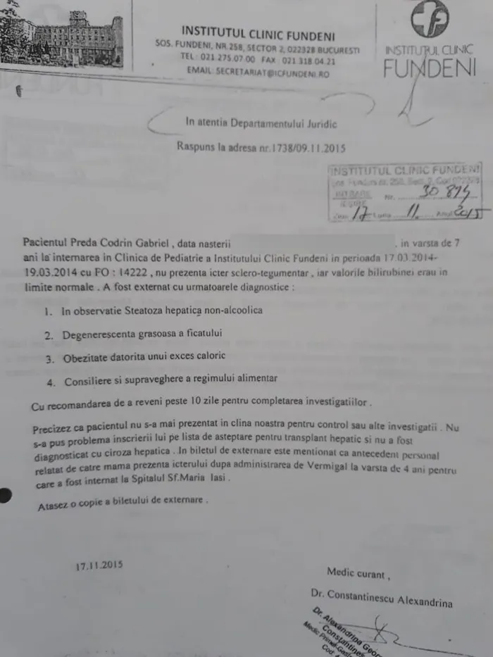*Institutul Fundeni confirmă prin documente faptul că în actul medical eliberat de această instituție și prezentat telespectatorilor fugitiv (ca pe o presupusă dovadă necesară că sunt, citez „medic incompetent, care nenorocește copii), nu este confirmat diagnosticul de ciroză hepatică și nici necesitatea unui transplant hepatic.