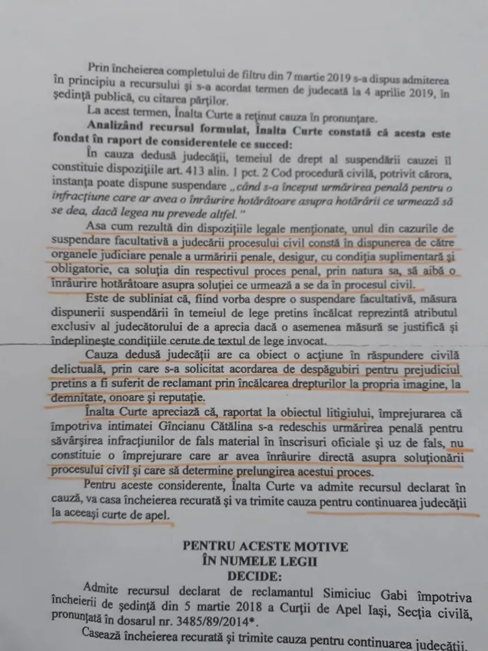 *Deoarece am considerat că nu era legală suspendarea cauzei civile până la rezolvarea definitivă a cauzei penale, întrucât era un proces ce viza denigrarea mea, am declarat recurs la ÎCCJ. Instanța ÎCCJ decide că suspendarea judecății cauzei civile nu era necesară și trimite cauza spre judecata aceleiași instanțe în vederea soluționării cauzei.