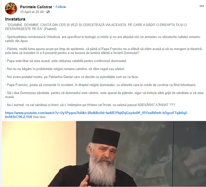 Reprezentanții Bisericii Ortodoxe au luat poziție în urma mesajului: „În contextul stării de urgență instituită în România pentru protejarea sănătății cetățenilor și stoparea extinderii actualei epidemii, orice mesaj solitar contrar celui oficial oferit de Patriarhia Romana, orice mesaj incitator la încălcarea reglementărilor fixate de autoritățile abilitate, inclusiv de cele ecleziastice la nivel instituțional, este unul care NU reprezintă Biserica Ortodoxă Română”, se mai arată în comunicatul BOR oferit ziarului Libertatea.