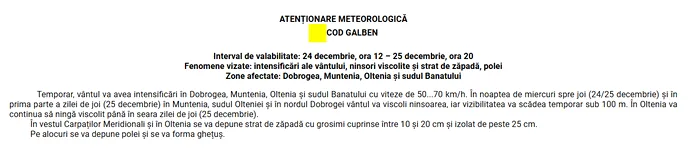 Administrația Națională de Meteorologie (ANM) a emis o atenționare meteorologică - cod galben -, valabilă în perioada 24 decembrie (ora 12:00) - 26 decembrie (ora 10:00).