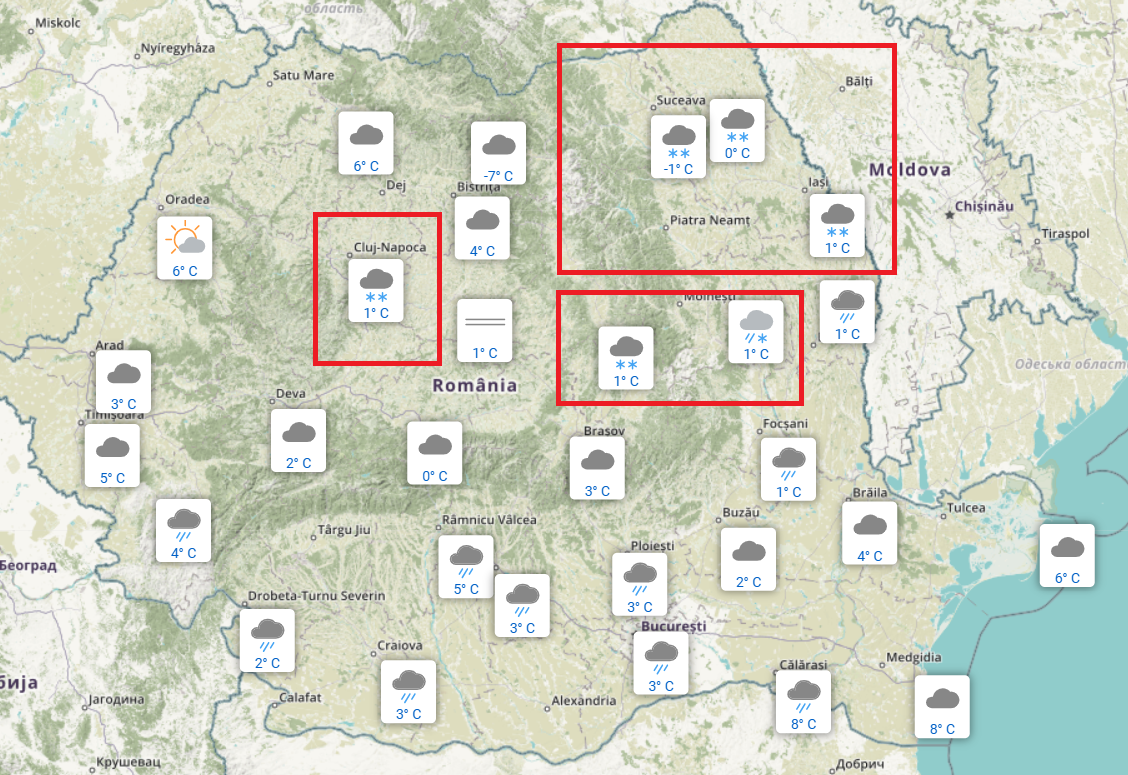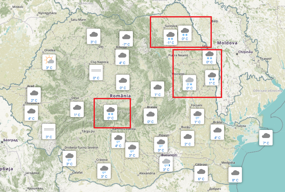 La ora 10:00, ninge în Suceava, Botoșani, Iași, Bacău și Târgu-Mureș, iar în alte localități a apărut lapovița.