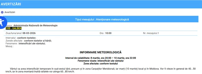 Meteorologii Administrației Naționale de Meteorologie (ANM) au emis o informare meteorologică, valabilă până în data de 10 martie, la ora 22.00.
