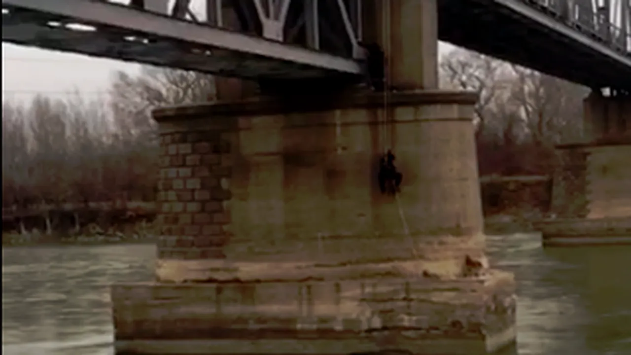 Cinci angajați ai Detașamentului de Pompieri Focșani au plecat către pod. Unul dintre pompieri a coborât cu ajutorul unei frânghii și a urcat cățelul pe pod.