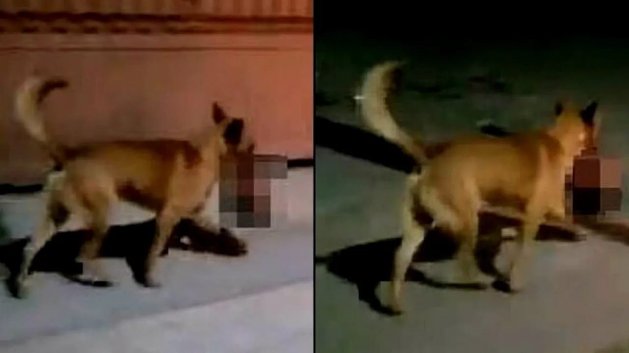 O filmare postată pe rețelele de socializare a arătat cum câinele merge pe o stradă întunecată, ținând un cap de om în gură, cel mai probabil urmând să îl mănânce.