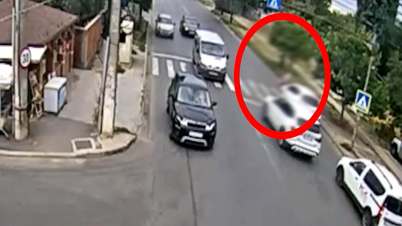 Accidentul a avut loc joi, la prânz, într-o intersecţie periculoasă din Popeşti-Leordeni. Nenorocirea a fost surprinsă de camerele de supraveghere.