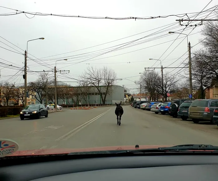 Măgărușul, lăsat liber, a fost surprins în zona intersecției Cioceanu, acolo unde mergea liniștit în zona destinată mașinilor.