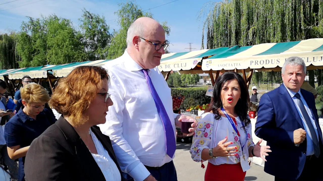 Așa a fost primit comisarul european pentru Agricultură, Phil Hogan, la Zilele Recoltei de la Cluj-Napoca. Aflat în vizită în România, oficialul european a avut timp să treacă și pe la târgul de bunătăți românești, însoțit de europarlamentarul liberal Daniel Buda, organizatorul Zilelor Clujului, Ramona Moldovan de la Asociația „Produs de Cluj” și cu ceva întârziere, ministrul Petre Daea.