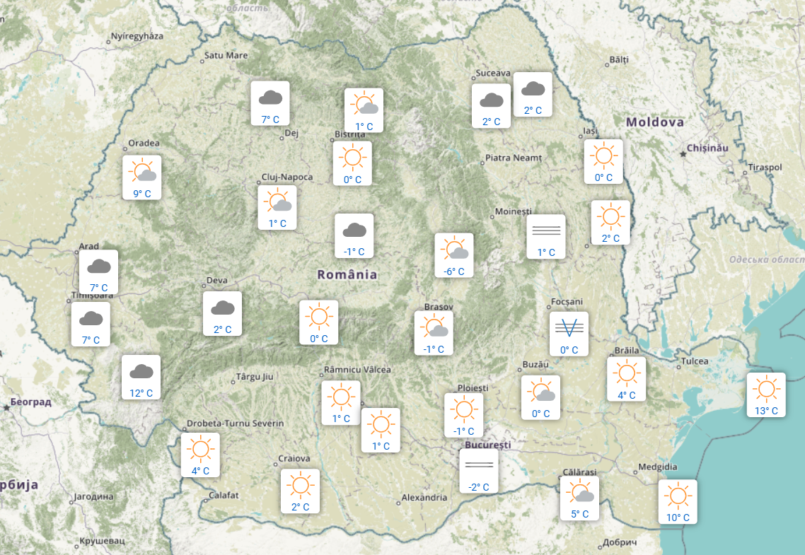 În partea de sud a țării cerul a fost mai mult senins – 4 grade la Derobeta-Turnu Severin, 2 grade la Craiova, 1 grad la Râmnicu Vâlcea și la Pitești, 0 grade la Buzău și 5 grade la Călărași.