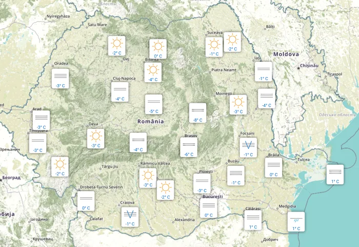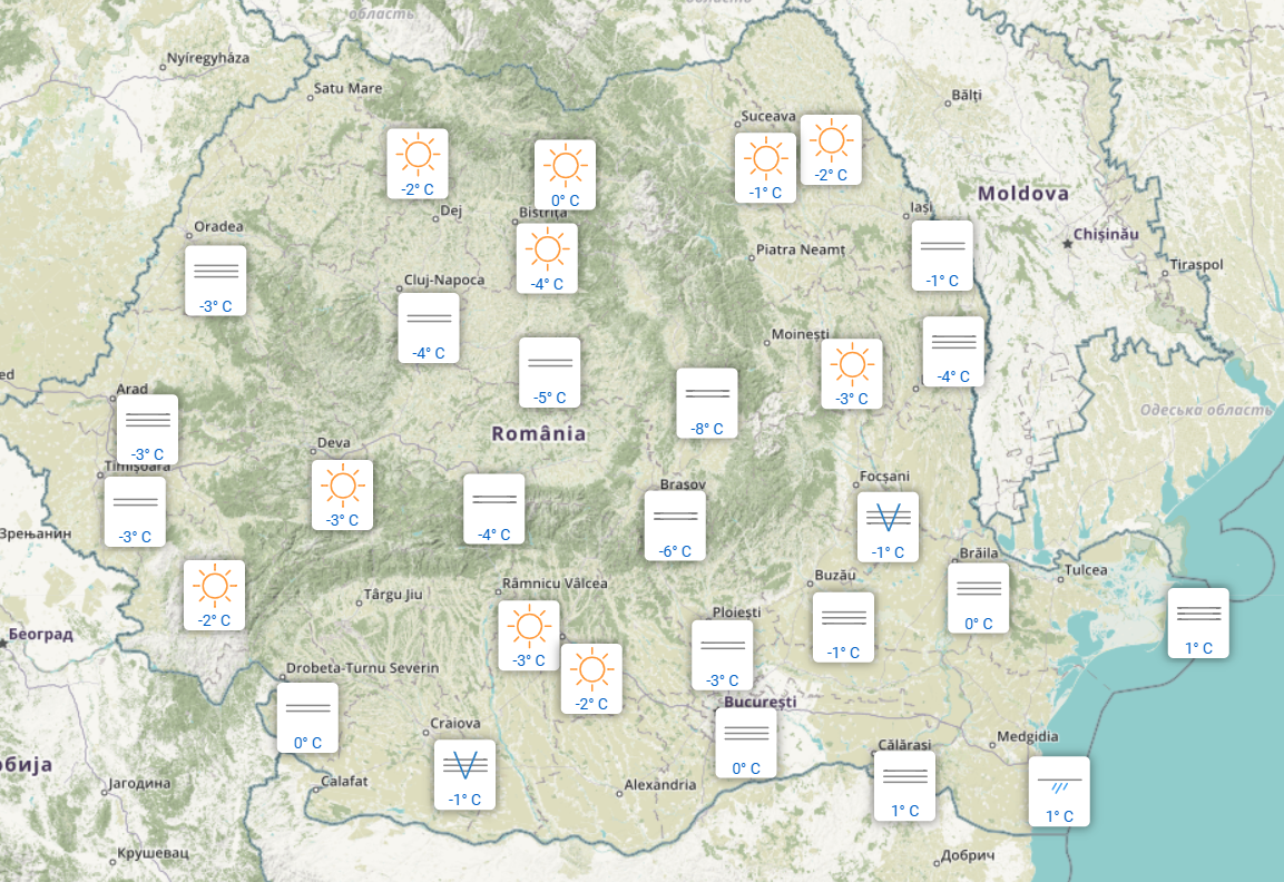În vestul țării, ceața și-a făcut simțită prezența. Au fost minus 3 grade la Arad, Oradea și Timișoara, iar la Reșița s-au înregistrat minus 2 grade Celsius.