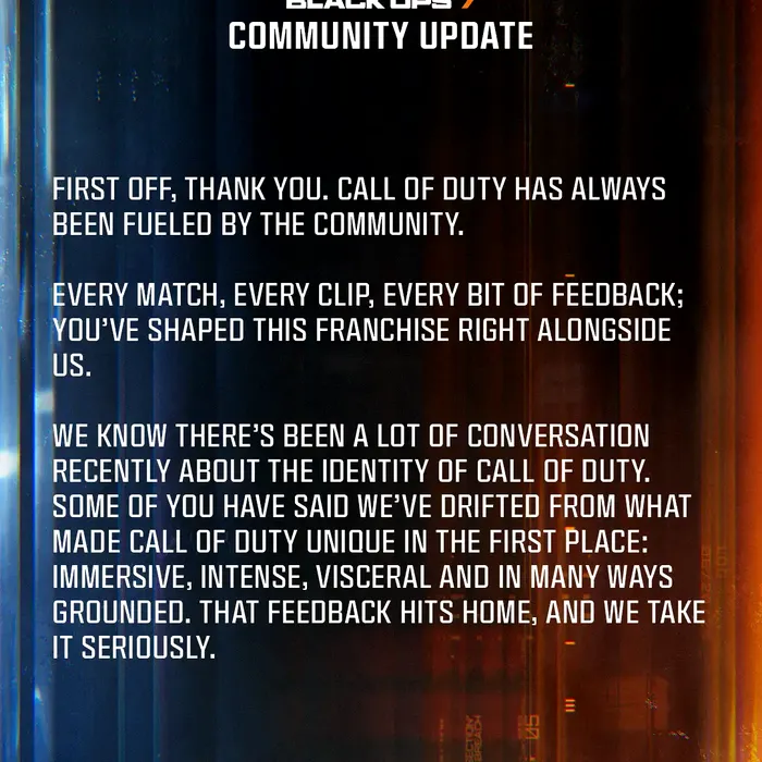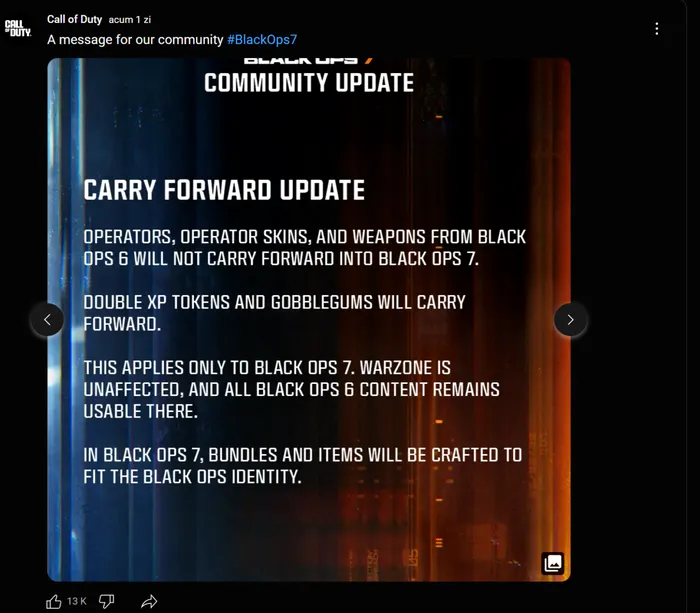 „Call of Duty a fost întotdeauna alimentat de comunitate. Fiecare meci, fiecare clip, fiecare feedback; voi ați modelat această franciză alături de noi. Știm că recent s-au discutat multe despre identitatea seriei Call of Duty. Unii dintre voi ați spus că ne-am îndepărtat de ceea ce a făcut Call of Duty unic: captivant, intens, și, în multe privințe, ancorat în realitate. Acest feedback îl luăm în serios. Vă înțelegem.De-a lungul dezvoltării, misiunea companiilor Treyarch și Raven a fost să ofere un „urmaș spiritual” pentru jocul Black Ops 2, făcând în același timp schimbări majore. Veți vedea acest lucru în Black Ops 7 în modul Multiplayer, Zombies, campania Co-Op (inclusiv Endgame) și chiar în Dead Ops Arcade 4. De-a lungul anilor, am avut o varietate de jocuri și experiențe de care fanii s-au bucurat, de la seria Modern Warfare la seria Black Ops și nu numai. Astăzi, am vrut să vă împărtășim câteva dintre modalitățile prin care abordăm lucrurile în Black Ops 7. Operatorii, skin-urile operatorilor și armele din Black Ops 6 nu vor mai fi incluse în Black Ops 7.Black Ops 7 trebuie să fie autentic pentru Call of Duty și contextul său. De aceea, skin-urile operatorilor și armelor din Black Ops 6 nu va fi inclus în Black Ops 7.”