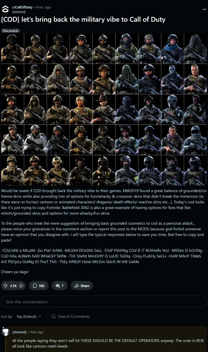 Un alt internaut a scris pe Reddit: „N-ar fi frumos să readucă atmosfera militărească în Call of Duty? Modern Warfare din 2019 a fost echilibrat între soldați cu uniforme militare și personaje ciudate care nu stricau atmosfera, precum dragoni, ursuleți de pluș, personaje animate, skin-uri radioactive etc. Call of Duty de azi arată ca o copie după Fortnite. Battlefield 2042 este un exemplu de joc care oferă o varietate de opțiuni pentru fanii care adoră simulatoarele militare și pentru cei care vor skin-uri amuzante și stranii”