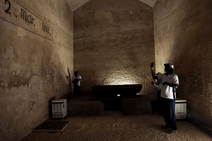 Odată intrați în piramidă, au coobrât aproape la 30 de metri adâncime, adânc în piramidă, pentru a explora camera mortuară a faraonului, excavată de Giovanni Belzoni în 1818. Acolo s-ar fi aflat mumia faraonului, dar în prezent este dispărută. Egiptologii speculează că Kefren ar fi fost faraonul care ar fi construit Sfinxul pentru că se află în proximitatea piramidei sale. O statuie cu faraonul șezând pe tron a fost descoperită.