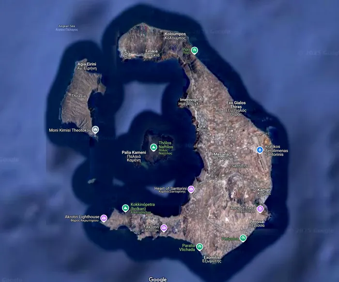 Santorini, cunoscută oficial și ca Thera sau Thira, are o suprafață de 73 km pătrați și se situează la 200 km de Grecia continentală. Este o insulă cu plaje vulcanice și peisaje impresionante, făcând dintr-un mic arhipelag circular format de caldeira vulcanică. Este populată de 15.480 de locuitori.
