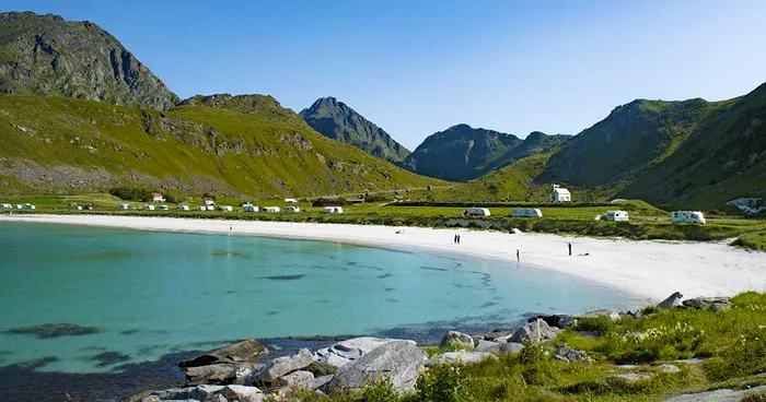 Ridicată din Marea Norvegiei precum coloana vertebrală a unui dragon, insula Lofoten de pe coasta de nord-vest a Norvegiei este un adevărat vis – indiferent dacă o vezi în lumina nemuritoare a Soarelui de la Miezul Nopții sau sub aurora boreală care dansează în zăpezile din lunile de iarnă. Plaja Haukland este absolut spectaculoasă, cu stânci de granit care răsar din loc în loc deasupra nisipurilor de culoarea spumei de cappuccino și a mării de safir. Apa este rece (nu atinge niciodată mai mult de 15 ° C), dar tot vei fi tentat să o încerci.