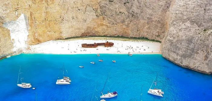 Plaja grecească pe cât de emblematică pentru eleni pe atât de spectaculoasă, Navagio, din Zakynthos este un loc în care s-ar putea să te bucuri dacă ai naufragia – de aici și porecla sa prozaică „Shipwreck Beach”. Cu stânci puternice care se ridică deasupra unui arc perfect de nisip și mare atât de albastră încât arată ca o poză prelucrată în Photoshop, această plajă rai pe pământ nu este un nici pe departe un secret. Dar dacă eviți vârful de sezon, merită totuși să mergi cu barca până aici, măcar pentru a rămâne mut de uimire în fața frumuseții ei.