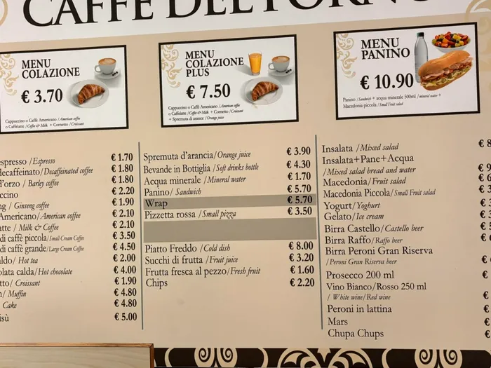 Un meniu simplu, numit „Menu Colazione”,  alcătuit dintr-un croissant și o cafea Cappuccino costă 3,70 de euro, pe când un meniu mai consistent, alcătuit dintr-un sandviș, o salată de fructe și o sticlă cu apă, cunoscut ca „Menu Panino”, costă 10,90 de euro.