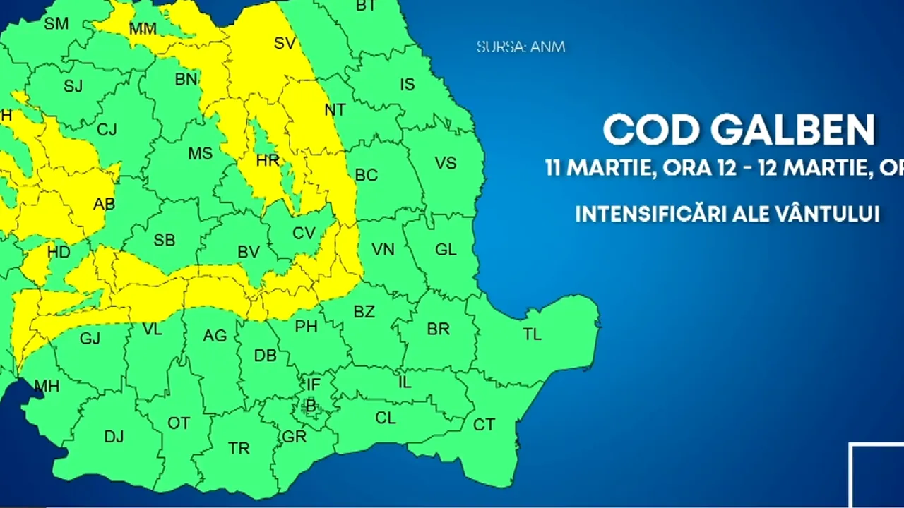 Meteorologii au emis o avertizare de cod galben de vânt puternic pentru zona montană a țării. Până mâine dimineață, la ora 08:00, 24 de județe din Arcul Carpatic vor fi afectate de rafale puternice, care în unele zone vor depăși 100 km/h.