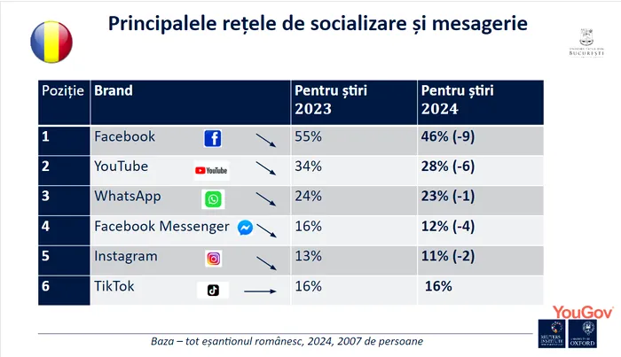 Principalele rețele de socializare și mesagerie folosite pentru știri: Facebook-ul rămâne, în continuare, primul, deși scade foarte mult în comparație cu anul trecut, 9 procente. Youtube-ul rămâne și el pe locul al doilea. Tiktok-ul se menține la 16%”, a explicat lector univ. dr. Antonia Matei.