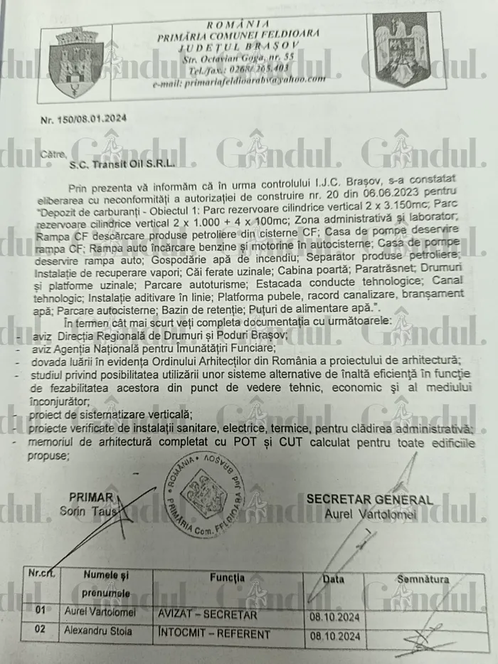 Primăria Feldioara – emitenta autorizației de construire – i-a informat pe reprezentanții TRANSIL OIL că Inspectoratul Județean în Construcții (IJC) Brașov a stabilit că documentația trebuie completată cu următoarele documente: