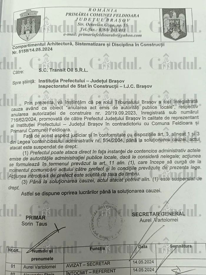 „Prin prezenta, vă înștiințăm că pe rolul Tribunalului Brașov a fost înregistrată cauza având ca obiect «anulare act emis de autorități publice locale», respectiv anularea autorizației de construire nr. 20/19.09.2023, înregistrată sub numărul 716/62/2024, promovată de către Prefectul Județului Brașov, în calitate de reprezentant al Instituției Prefectului – Județul Brașov, în contradictoriul cu Comuna Feldioara și Primarul Comunei Feldioara. (…) Astfel, se dispune oprirea lucrărilor până la soluționarea cauzei”, a transmis primarul din Feldioara către TRANSIT OIL.