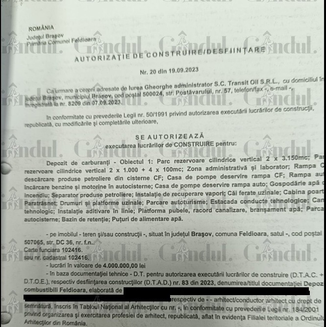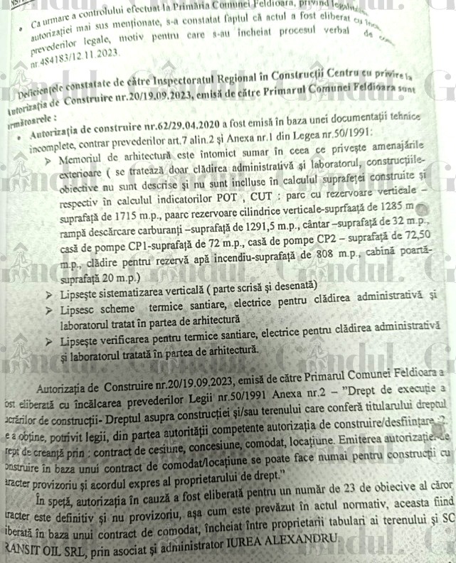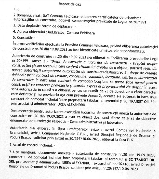Ulterior, în data de 19.09.2023, primarul Sorin Taus emite autorizația de construire nr. 20. prin care sunt autorizate lucrările de construire – în valoare de 4 milioane RON – la depozitul de carburanți Feldioara, firma beneficiară fiind TRANSIT OIL. ISC a descoperit că documentația depusă nu era completă, iar autorizația emisă de primarul Taus nu respecta legea.