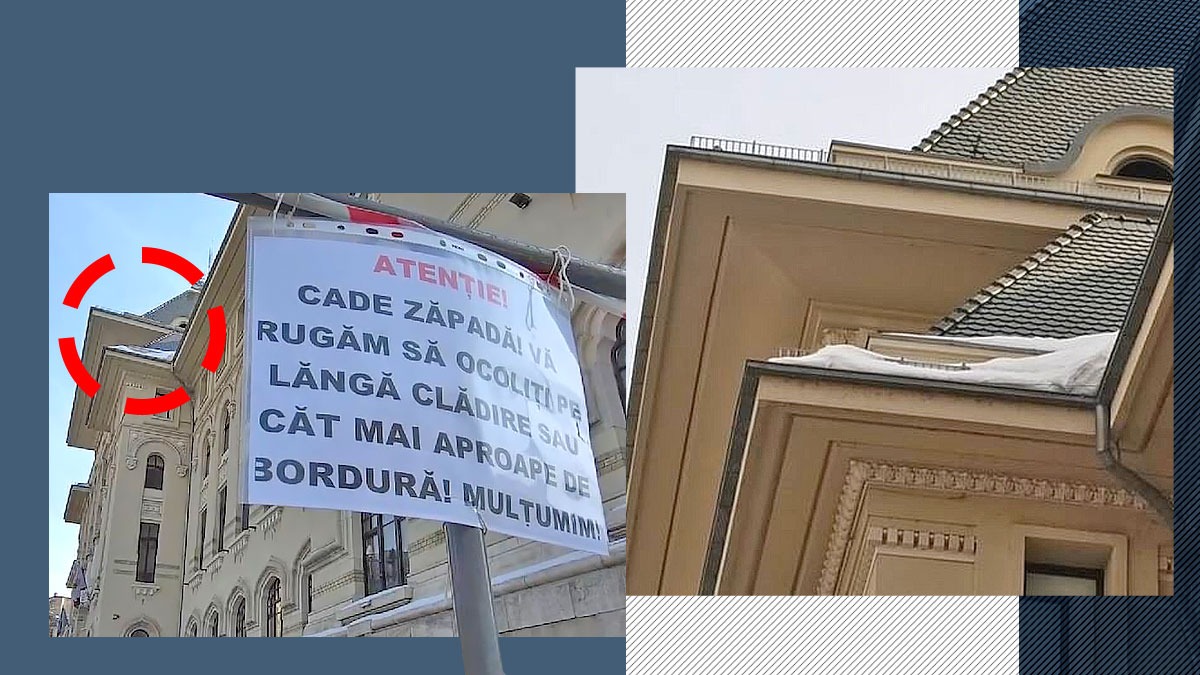 Situație absurdă pe trotuar în față la Primăria Capitalei, miercuri, la orele prânzului. În loc să curețe zăpada de pe acoperiș, Administrația Bucureștiului a montat garduri cu afișe, prin care trecătorii sunt avertizați să se ferească de omătul ce poate cădea de pe acoperiș.