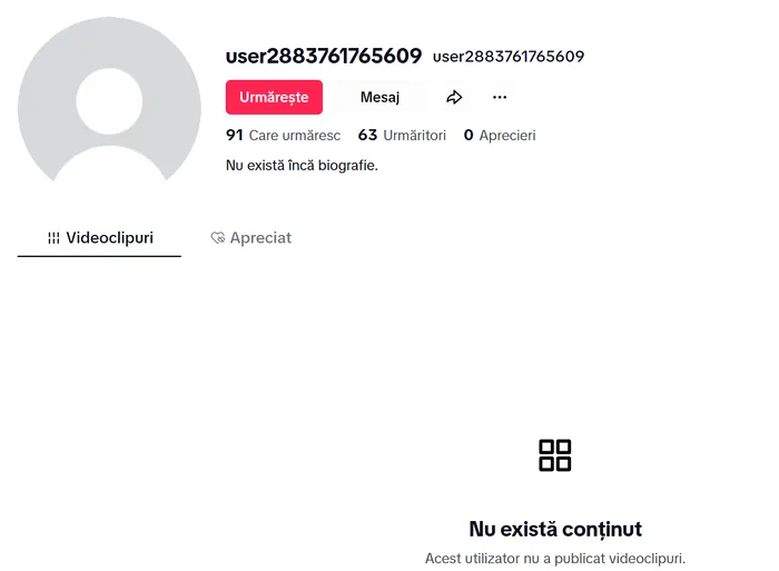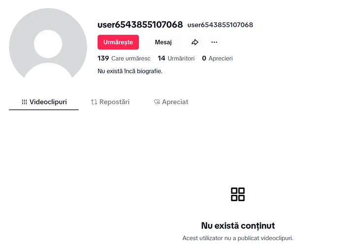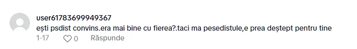 „Ești psd-ist convins. Era mai bine cu Firea. Taci, mă pesedistule, e prea deștept (n.red. – Nicușor Dan) pentru tine” – mesaj postat de „user61783699949367”. Cont TikTok fără conținut, fără foto, fără vreo informație suplimentară.
