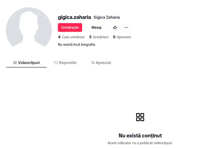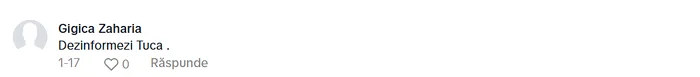 „Dezinformezi Tucă” – mesaj postat de „Gigica Zaharia”. Cont TikTok fără conținut, fără foto de profil, urmărit de 5 persoane.