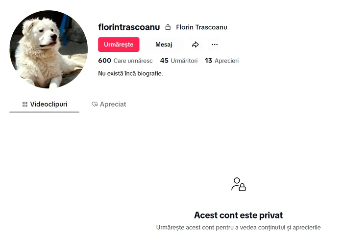 „Nicușor nr. 1”, scrie Florin Trascaoanu. Contul de TikTok este privat, iar la fotografia de profil se află un câine.