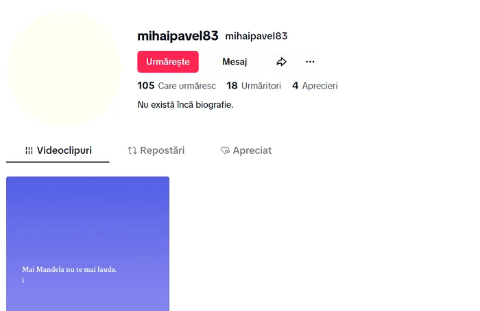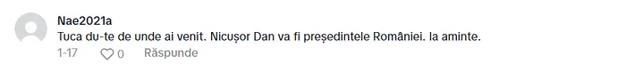 „Tucă, du-te de unde ai venit. Nicușor Dan va fi președintele României. Ia aminte” – mesaj postat de „Nae20121a”. Contul are 2 videclipuri postate și ar fi urmărit de 164 de persoane. Nu există, bineînțeles, nicio fotografie de profil.