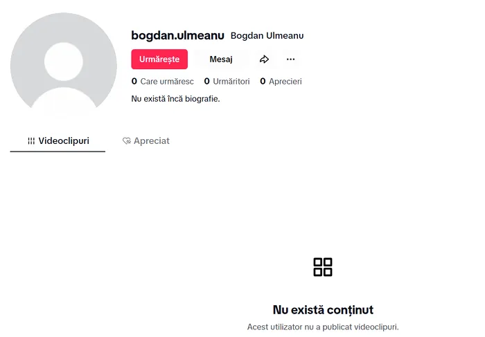 „Cel mai bun primar al Capitalei” – mesaj postat de „Bogdan Ulmeanu”. Cont TikTok fără conținut, 0 la „care urmăresc”, „urmăritori” și „aprecieri”.