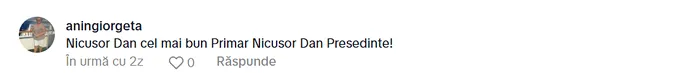 Iar mesajele postate de pe conturi TikTok cel puțin ciudate continuă îb același ritm susținut. Nicușor Dan ar fi cel mai bun primar „de la revoluție”, iar opinia aparține celui care are ca nickname „distrugătoruldeproști”.