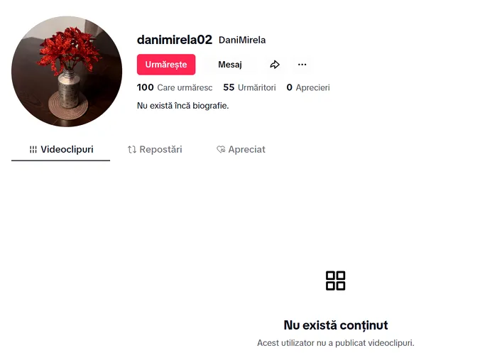 „Votăm Nicușor Dan!”, scrie DaniMirela, contul fiind unul care nu are conținut și care prezintă o fotografie cu o vază cu flori.