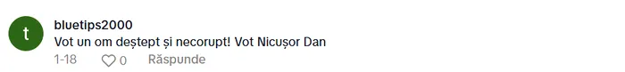 „Vot un om deștept și necorupt” – mesaj postat de „bluetips2000”. Contul TikTok nu are conținut.