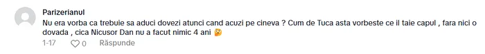 „Nu era vorba că trebuie să aduci dovezi atunci când acuzi pe cineva? Cum de Tucă ăsta vorbește ce îl taie capul, fără nicio dovadă, cică Nicușor Dan nu a făcut nimic 4 ani” – mesaj postat de „Parizerianul”. Nicio surpriză, contul TikTok nu are conținut.
