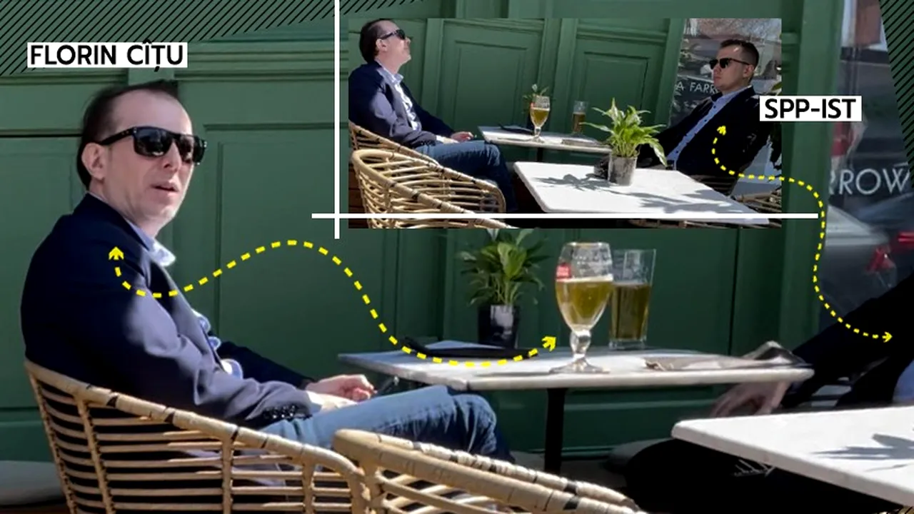 Ambii s-au așezat regulamentar la terasa unde au ras două berici la draft, reci ca gheața. În acest timp, protecția îi era asigurată de patru ofițeri SPP, plătiți la rândul lor cu salarii consistente de la bugetul statului. în imagini se vede SPP-istul comesean, însă potrivit informațiilor GÂNDUL, al doilea om în Stat este păzit in permanenta de 4 SPP-iști.