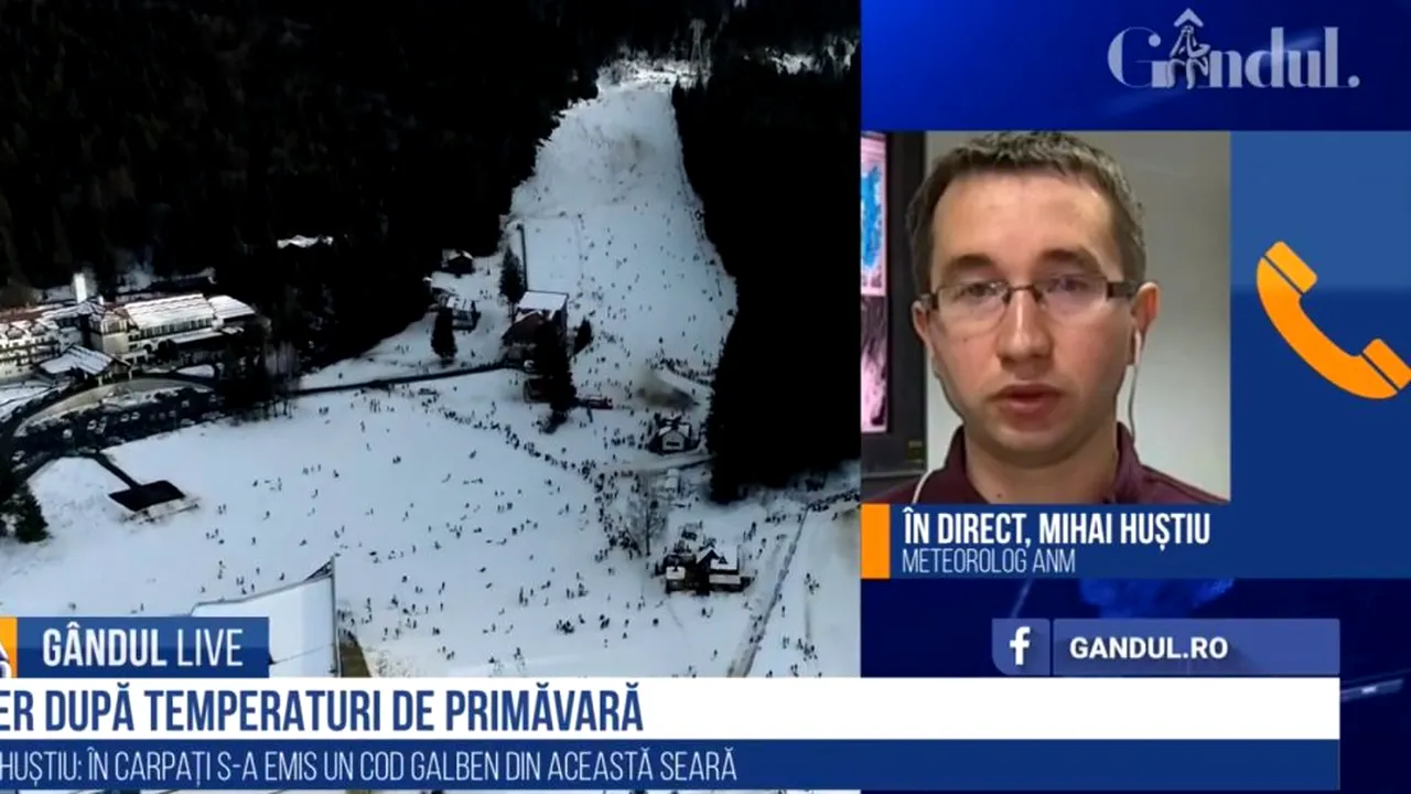 „Însă, nu sunt vești bune pentru anumite zone ale țării, și mă refer aici la Carpații Occidentali, la Carpații Orientali, în partea nordică și vestul Carpaților Meridionali, unde tocmai am emis un cod galben ce vizează cantități de apă însemnate din această seară până joi la prânz, interval în care va ploua temperar și se vor acumula cantități de apă de 25-30 de litri pe metrul pătrat, și pe suprafețe mici chiar 40-60 de litri. Stratul de zăpadă existent chiar și la munte se va topi, apa va ceda din acest strat și foarte probabil vor fi și evenimente hidrologice. De altfel, și hidrologii au emis cod portocaliu pentru anumite râuri din Crișana și Maramureș în acest interval în care temporar va ploua. Și veștile nu sunt bune nici în continurare. După această perioadă foarte caldă, vremea se va răci accentuat începând de joi după-amiază. O masă de aer rece, de altfel prezent pe Europa Centrală, Nordică, deja a afectat multe țări europene, pătrunde și peste țara noastră la acest final de săptămână, încă de joi după-amiază, dinspre vestul, nordul țării. O masă de aer deosebit de rece cuprinde toată țara, iar noaptea de joi spre vineri va fi geroasă în vest, nord și centru, cu temperaturi ce vor scădea la minus 14 – minus 15 grade. Cu alte cuvinte, alternanțe mari de temperatură joi, de la vreme foarte caldă joi, în sud-est, la temperaturi sub limita gerului în nord-vestul țării, și la contactul dintre cele două mase de aer, temperar vor fi precipitații, la început ploi, apoi și lapoviță și ninsoare. Și chiar așteptăm și descărcări electrice aici, în partea de sud-est a țării. Spuneam că contrastul termic este foarte mare între masa rece și masa caldă și de aceea avem parte și de astfel de fenomene mai intense și nespecifice acestui sezon, pe lângă vântul care va sufla destul de tare cu rafale de 60-80 de kilometri pe oră, iar la munte cu peste 120 de kilometri pe oră”, a explicat Mihai Huștiu.