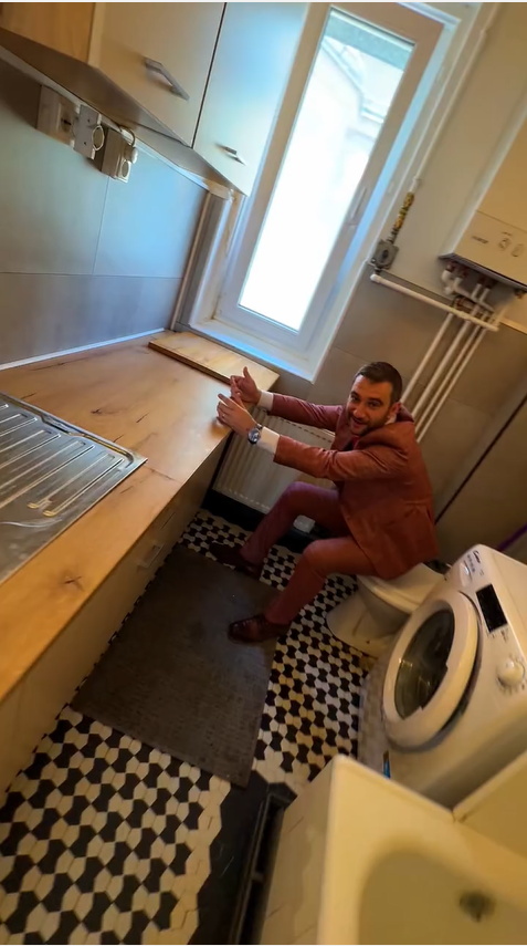 Mai exact, locuința de doar 20 de metri pătrați are amenajată o bucătărie în baie, ambele îngrămădite într-un spațiu minuscul. Agentul imobiliar afirmă că, inițial, vasul de toaletă se afla lângă frigider și la indicațiile acestuia, proprietarul a schimbat totuși amplasarea electrocasnicelor.