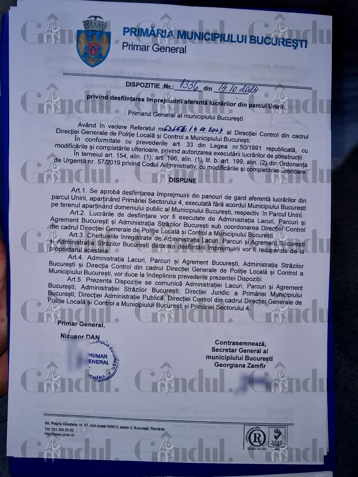 Primarul Capitalei, Nicușor Dan, a emis, luni seară, o dispoziție prin care aprobă desființarea împrejmuirii din panouri de gard aferentă lucrărilor din Parcul Unirii.