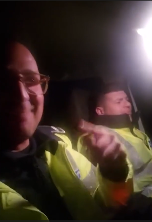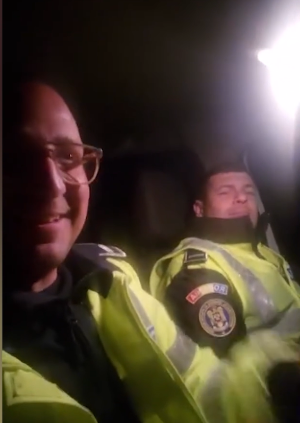 În clipul, devenit viral pe internet, polițiștii par să ignore regulile de circulație și se filmează chiar în timp ce unul dintre ei conduce autospeciala, pe timp de noapte.