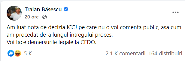 ”Am luat notă de decizia ÎCCJ pe care nu o voi comenta public, așa cum am procedat de-a lungul întregului proces. Voi face demersurile legale la CEDO”, a scris Traian Băsescu pe pagina sa de socializare.