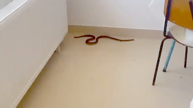 Acesta s-a târât pe coridoarele spitalului, apoi s-a refugiat într-o sală de mese. O persoană a filmat reptila, iar pe imagini se vede cum șarpele de un metru se ascunde inițial sub un calorifer, apoi se târăște pe perete, încercând să găsească o ieșire. Cum fereastra sălii de mese era închisă, reptila nu putea să scape. Medicii au chemat jandarmii, iar în mai puțin de 10 minute șarpele a fost prins și eliberat.